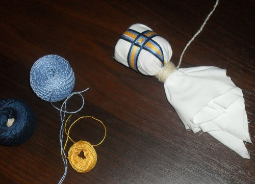 A long strip of cloth very tightly wound into a neat barrel (head), which is then wound around the square of white cloth. Created likeness wearing a headscarf on his head frizz by a thin thread, forming the neck of the article.